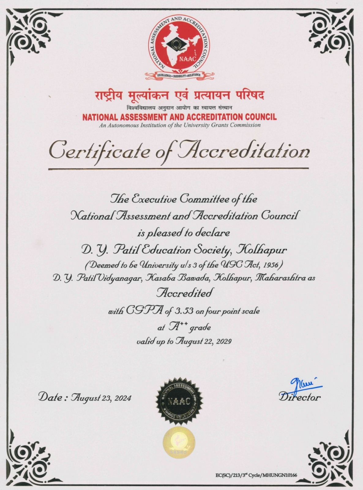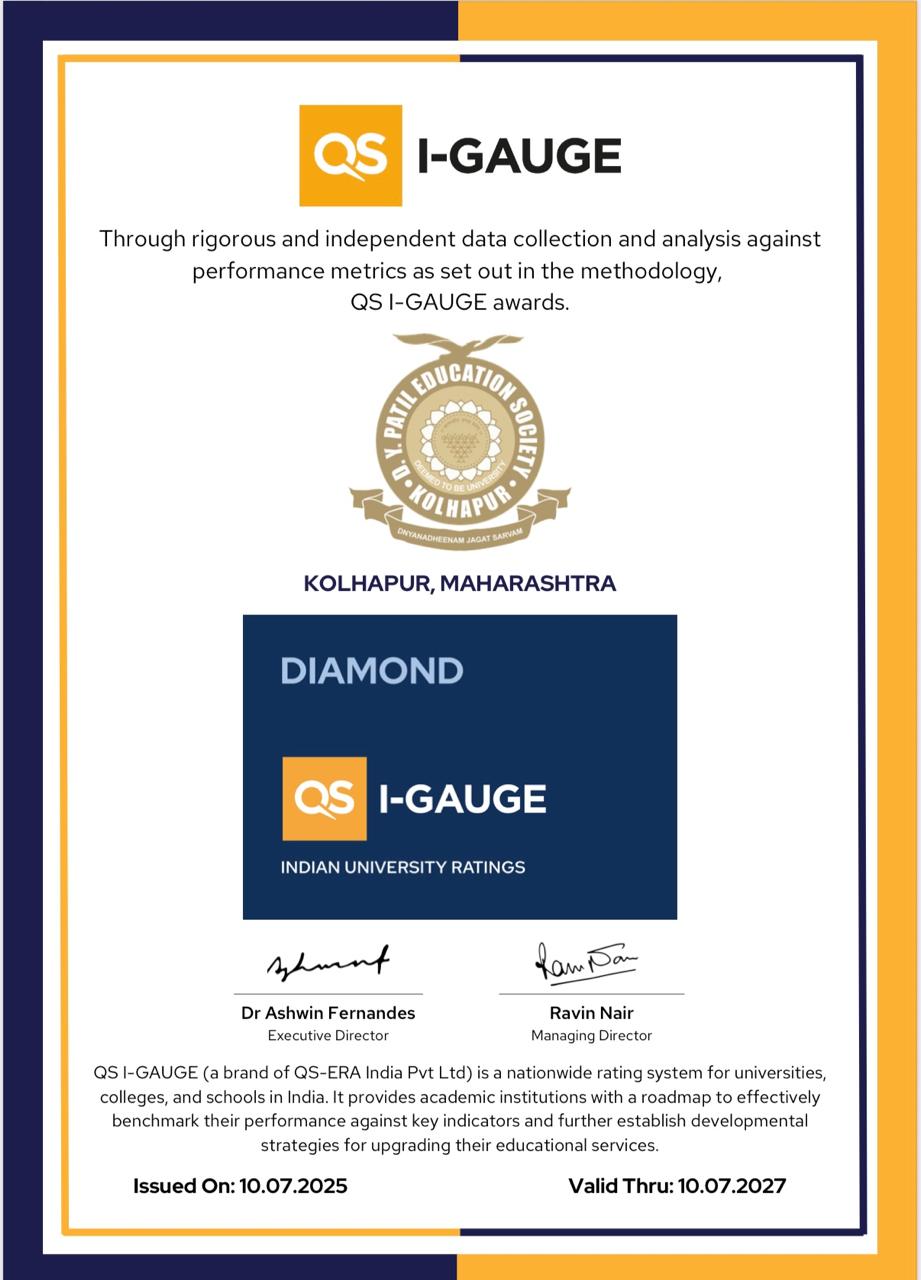 The “School of Engineering & Management”, approved by AICTE, is the eighth constituent unit of the D. Y. Patil Education Society (Deemed to be University), Kolhapur, which is nationally regarded as one of the preferred destinations for pursuing academic programs in Medicine, Nursing, Physiotherapy, Hospitality Studies, Allied Health Sciences, Pharmacy, and Interdisciplinary Studies along with cutting edge research in interdisciplinary fields specially in health sciences, stem cells, tissue engineering, nano-materials, and energy storage devices. DYPES was granted the status of a Deemed to be University by the then Ministry of Human Resource Development, Government of India, under Section 3 of University Grants Commission Act on September 01, 2005.