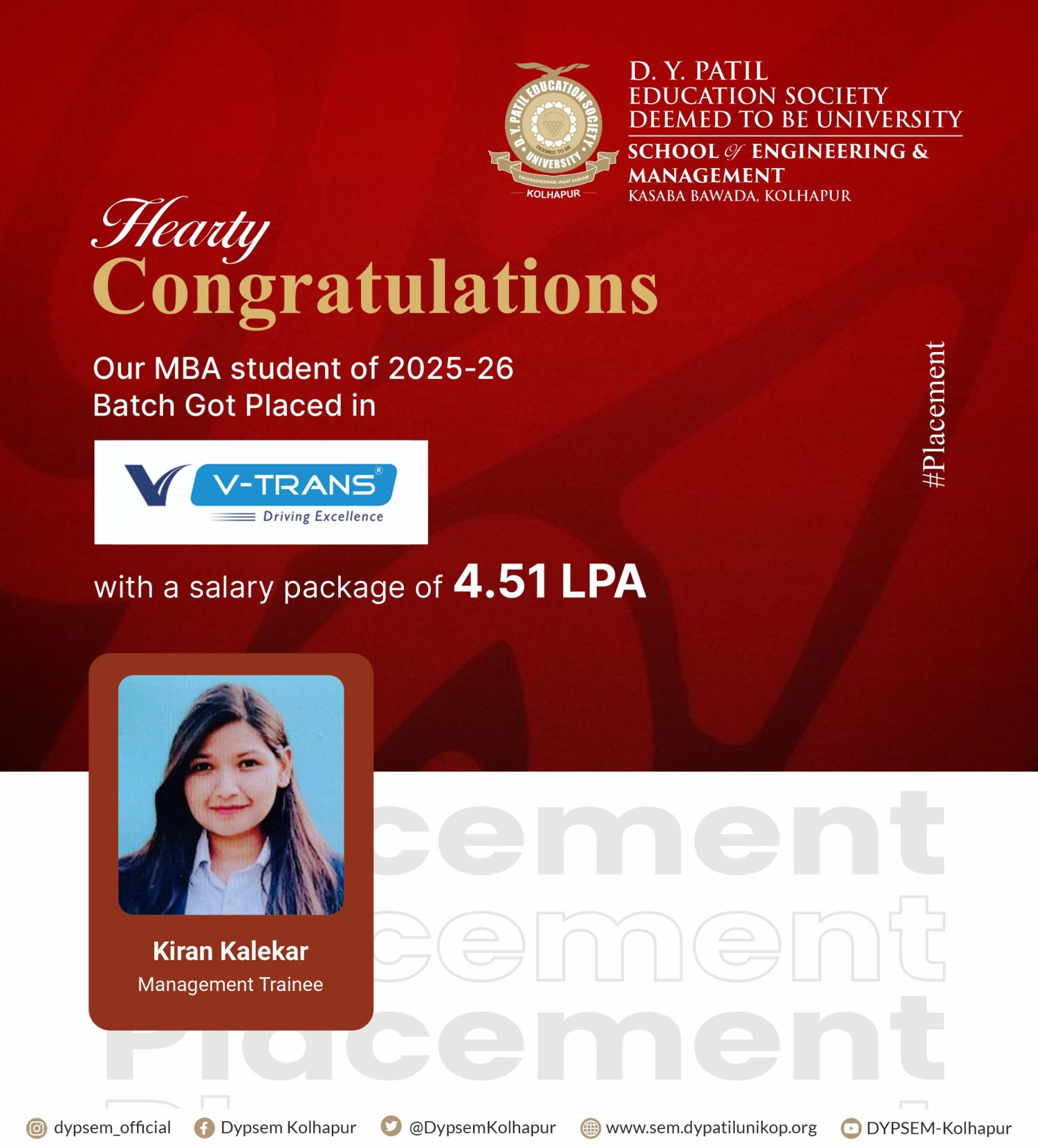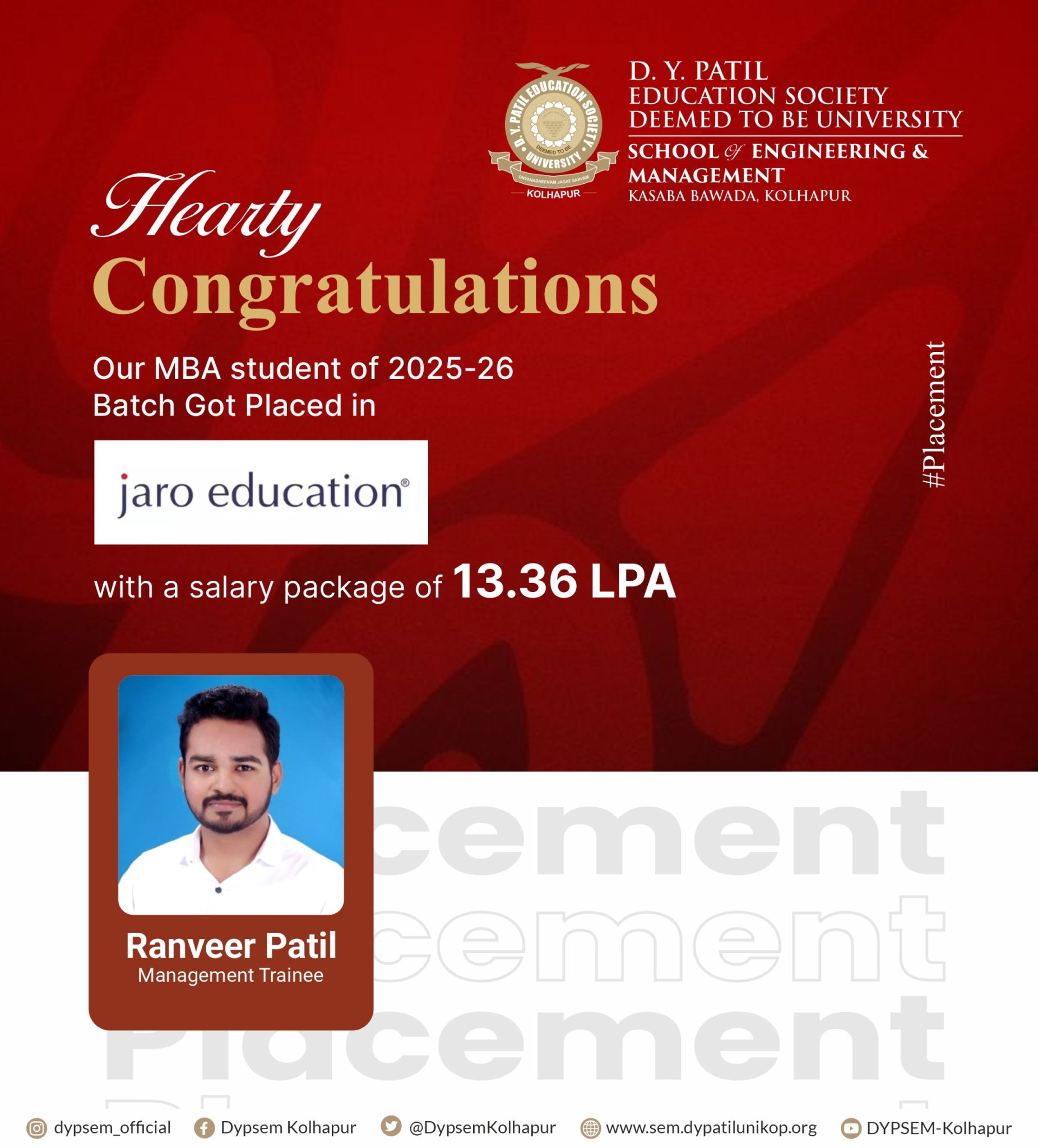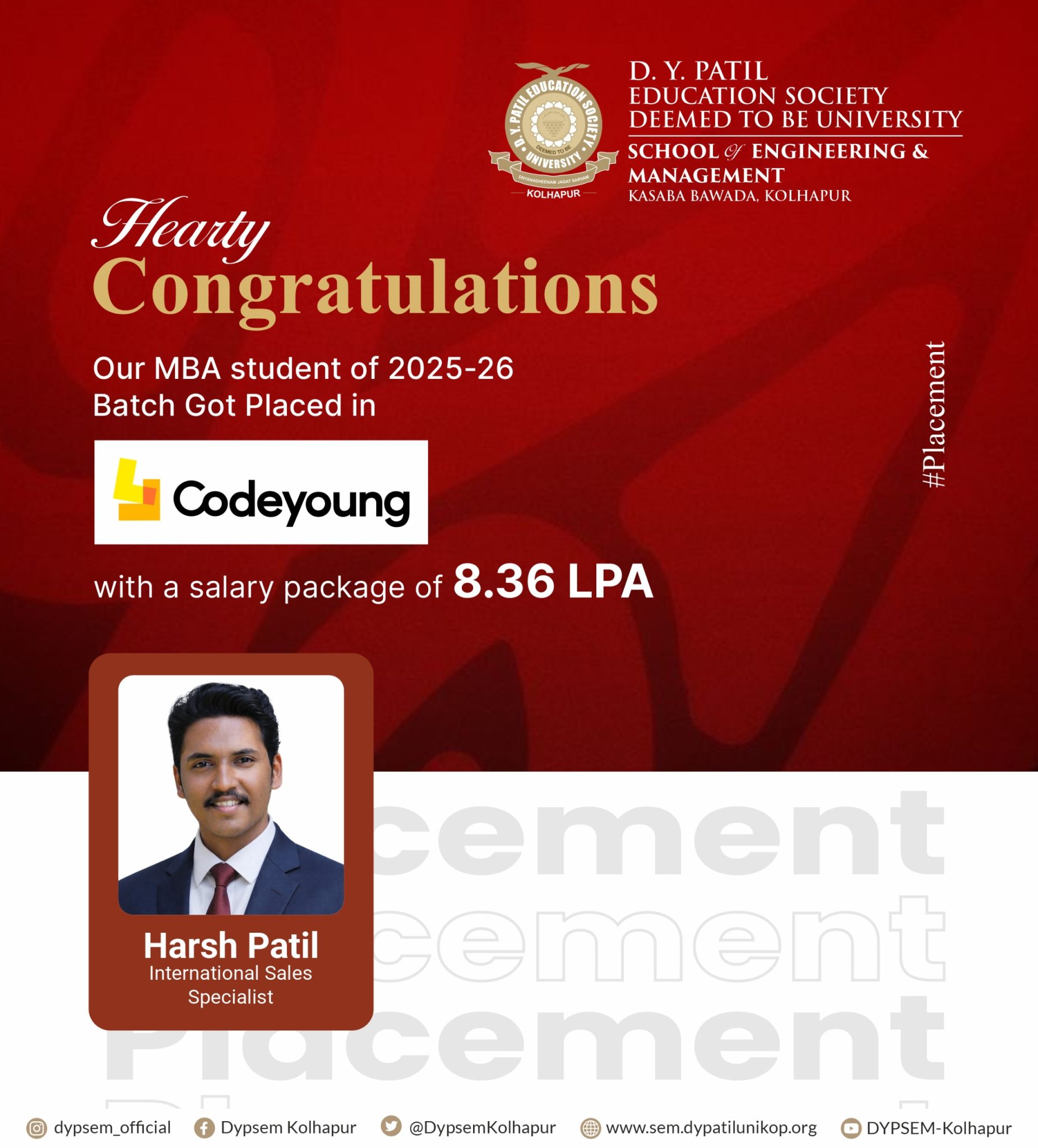 Training and Placement activities of D Y Patil School of Engineering & Management, Kasaba Bawada, Kolhapur will be handled by central TPO, established for D Y Patil Education Society (Deemed to be University) Kolhapur. This will help in placing our graduating students from our new School of Engineering and Management with B Tech, MCA & MBA in the right company. The Placement Cell provides complete support to the visiting companies at every stage of the placement process. Arrangements for Pre-Placement Talks, Online/Offline Tests, Interviews, and Group Discussions are made as per the requirement of the visiting companies.