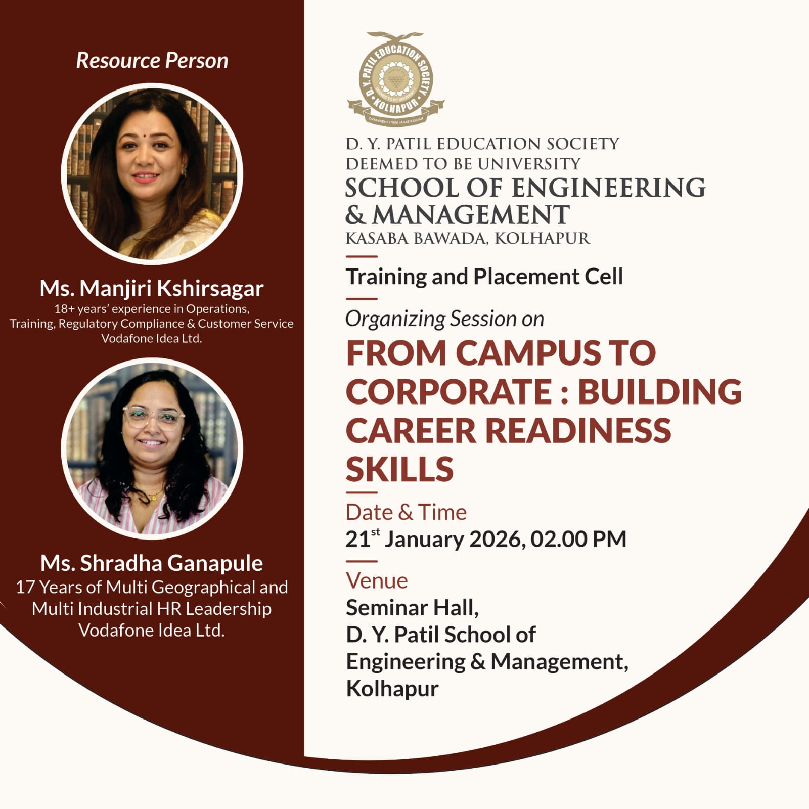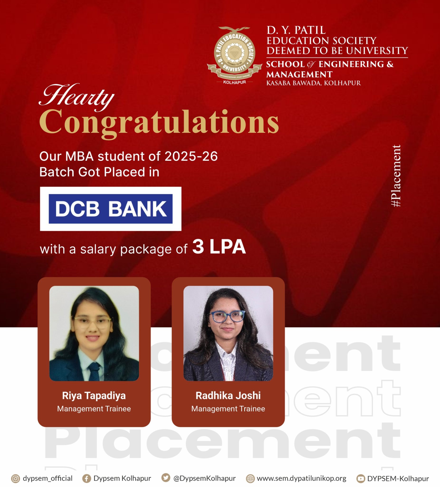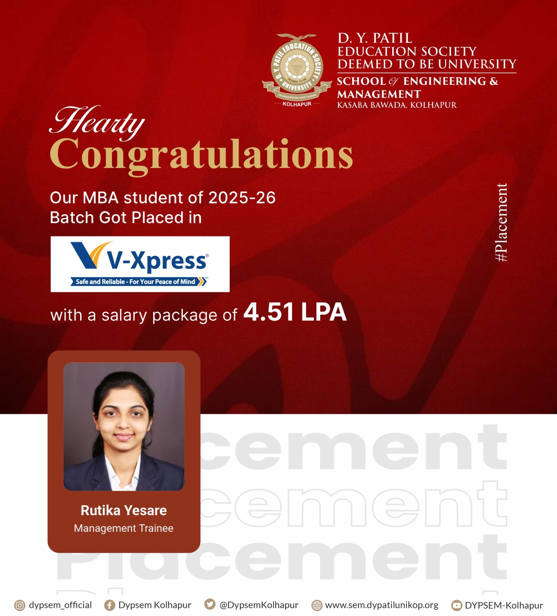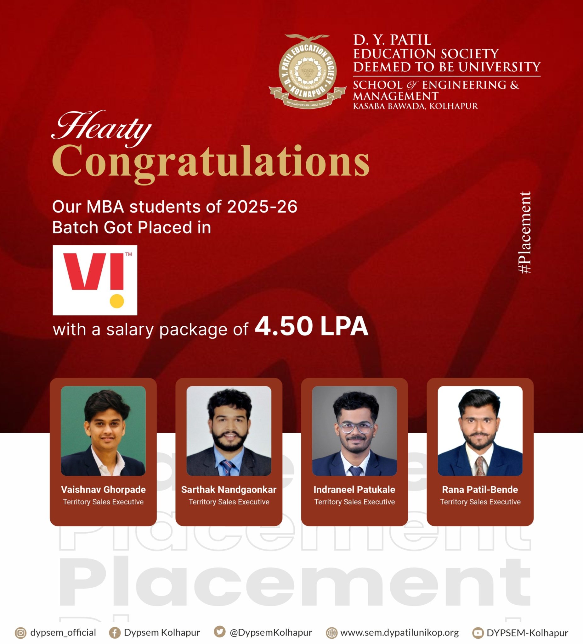 Training and Placement activities of D Y Patil School of Engineering & Management, Kasaba Bawada, Kolhapur will be handled by central TPO, established for D Y Patil Education Society (Deemed to be University) Kolhapur. This will help in placing our graduating students from our new School of Engineering and Management with B Tech, MCA & MBA in the right company. The Placement Cell provides complete support to the visiting companies at every stage of the placement process. Arrangements for Pre-Placement Talks, Online/Offline Tests, Interviews, and Group Discussions are made as per the requirement of the visiting companies.